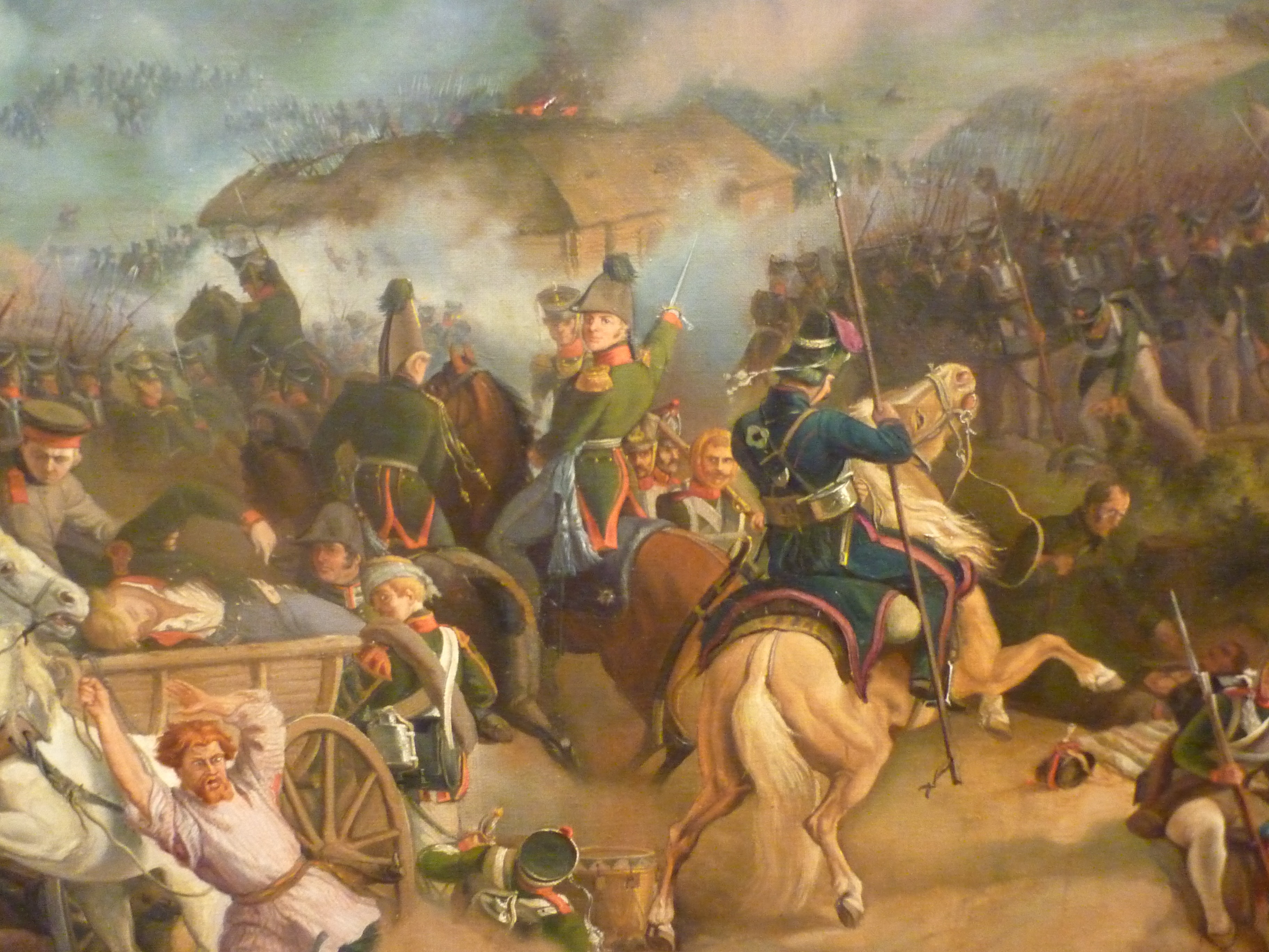 Именно в России удача оставила французского завоевателя. Русская армия сумела остановить его натиск, вынудив его отступать по неласковым заснеженным просторам. Великая армия перестала соответствовать своему гордому названию: физически и морально истощенные солдаты утратили боевой дух. Эта тема звучит на выставке в работе Ежи Коссака «Отступление Наполеона из России»